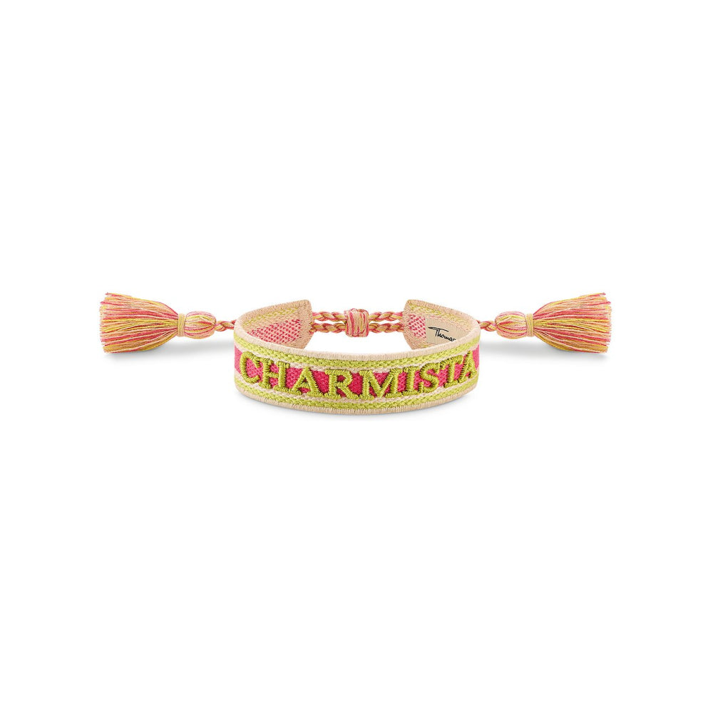 The Thomas Sabo Colourful Woven Festival Bracelet is a multi-coloured, woven bracelet with a width of 15mm. In the style of a festival bracelet, it features Charmista appliqués in pink, green and orange. The sliding clasp with tassels allows an adjustable length of 15 to 24cm.