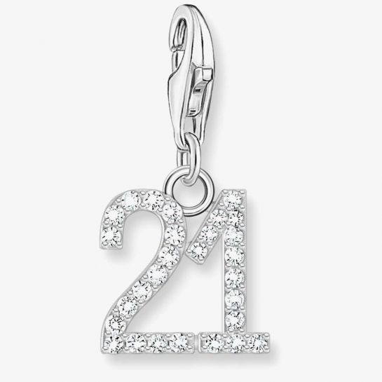 The Thomas Sabo Silver Number 21 CZ Charm is crafted from recycled Sterling Silver and takes the shape of the number 21 and is adorned with sparkling white cubic zirconia stones.