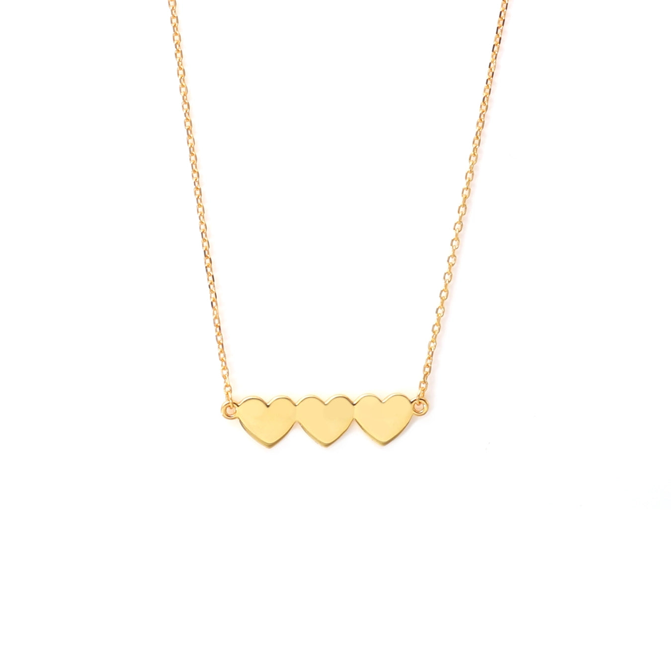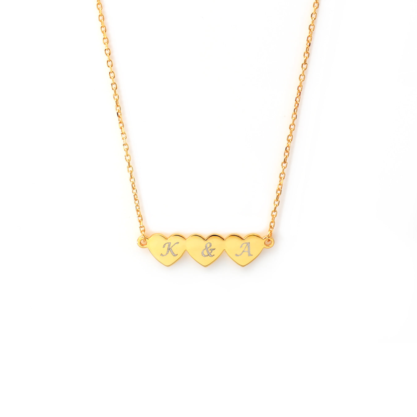 The Triple Heart Necklace in yellow gold features three interlinked hearts, symbolizing love and connection. Crafted with high-quality yellow gold plating, this sentimental and personalized piece serves as a thoughtful gift, celebrating relationships and meaningful bonds. Its design ensures durability and timeless appeal, making it suitable for various occasions.